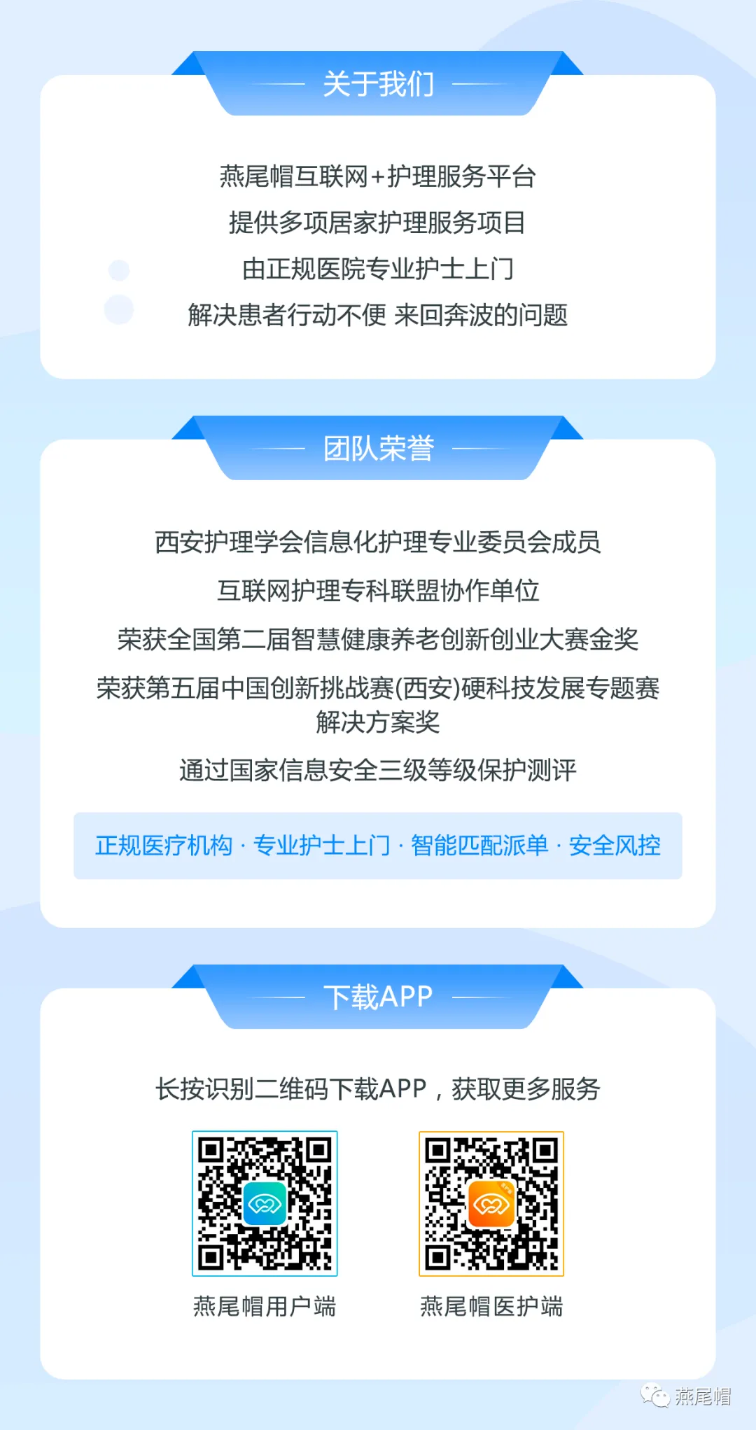 燕尾帽护理上门服务平台,是经严格资质审核的正规护理服务平台。我们的核心价值很简单:搭建起“居家需求者与持证护士”的直达桥梁。