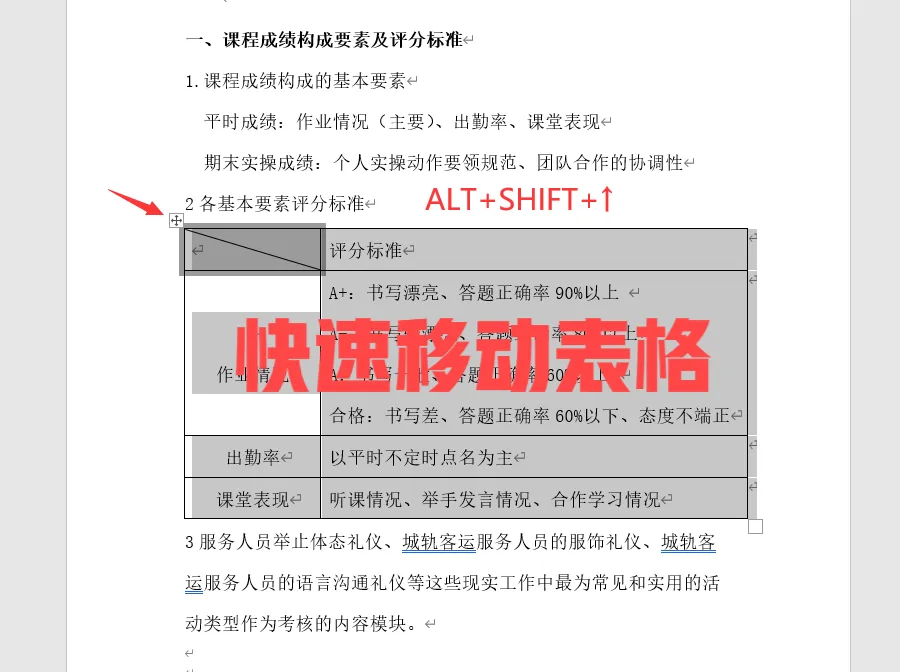 但这种方法往往因文档中存在其他文字,导致拖动时表格与文字的排版错乱,影响文档的整体美观与可读性。表姐教你一招,利用ALT+SHIFT+方向键,实现表格的精准定位移动。
