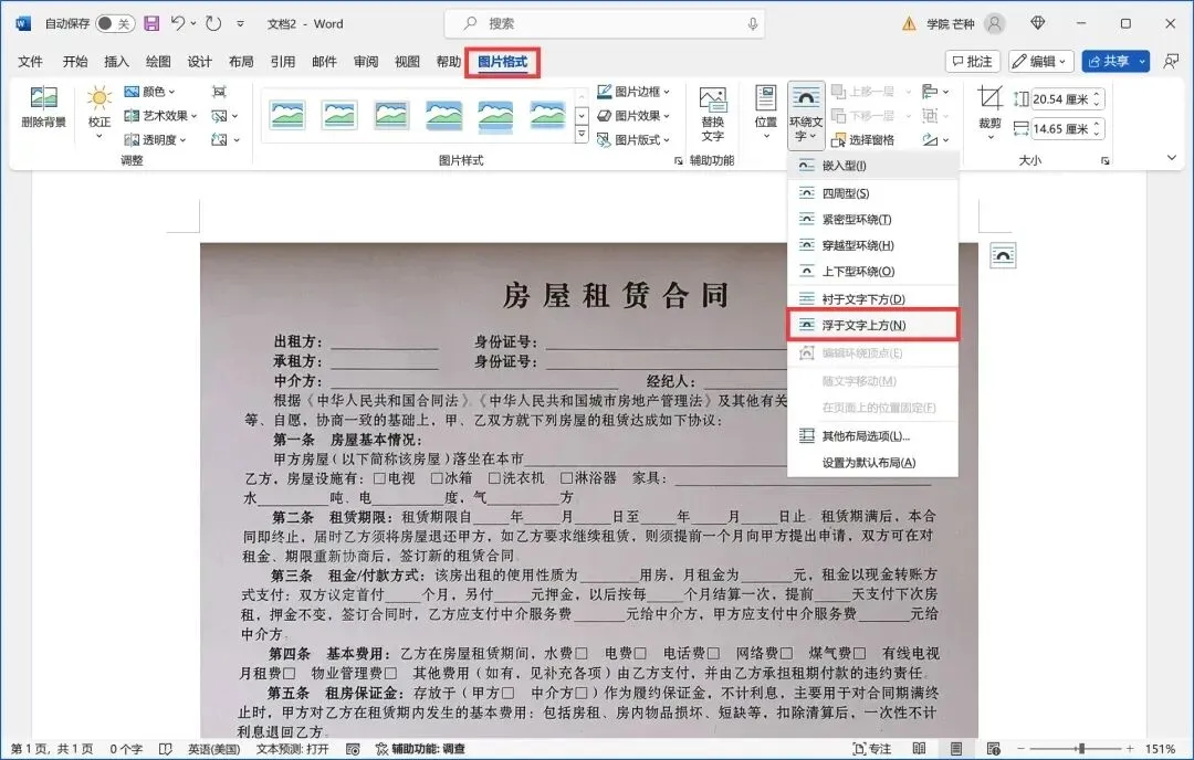 插入图片后,选中该图片,此时Word顶部会显示出“图片格式”选项卡。在这个选项卡下,找到“环绕文字”按钮并点击,从弹出的菜单中选择“浮于文字上方”。