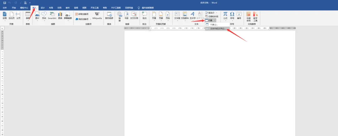 “对象”按钮就隐匿在这个组里,点击它,会弹出一个下拉菜单,这个菜单如同一个功能分支路口,其中“文件中的文字”选项就是我们要探寻的通往合并之路的入口,选择它,便能开启文档合并的奇妙之旅。