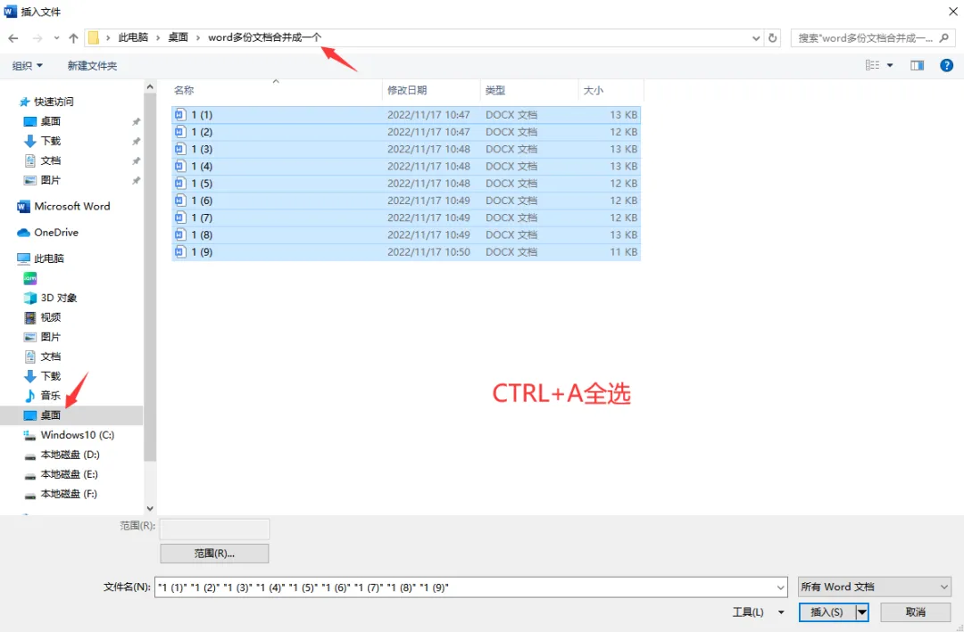 全选时要仔细检查,确保没有遗漏任何一个文档,否则合并后的文档就会缺失部分内容。确认无误后,点击对话框右下角的“插入”按钮,↓