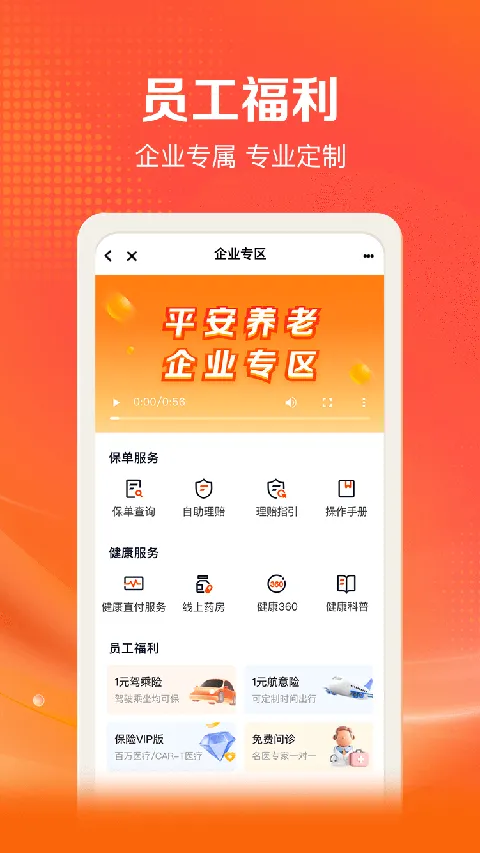 1.保险•查保单:全面查阅保障情况,涵盖企业团体保单和个人家庭保单;•办理赔:自助理赔,秒级到账,进度透明,实时查阅。2.健康•药械商城:正品保价,支持健康直付服务;•线上医院:可开处方药,送药上门,符合保障约定客户支持直付/代理赔/自付;•企业员康:提供多种企业健管服务套餐,健康360、家庭医生、安享无忧;•健康体检:团检、家人体检均可线上预约,在线查看报告,免费报告解读。3.养老•企业年金:支持企业年金账户三查,查余额、查缴费、查详情;支持企业年金受托服务全流程线上化,包括新人参与年金计划、调整投资比例、退休领取申请;•个人养老保险:涵盖分红型、万能型、专属商业养老保险等年金保险产品;•养老服务:链接居家养老、社区养老、机构养老等供应商,提供居家照护、失能护理、康复训练等养老服务。4.活动•注册用户享受免费问诊服务;