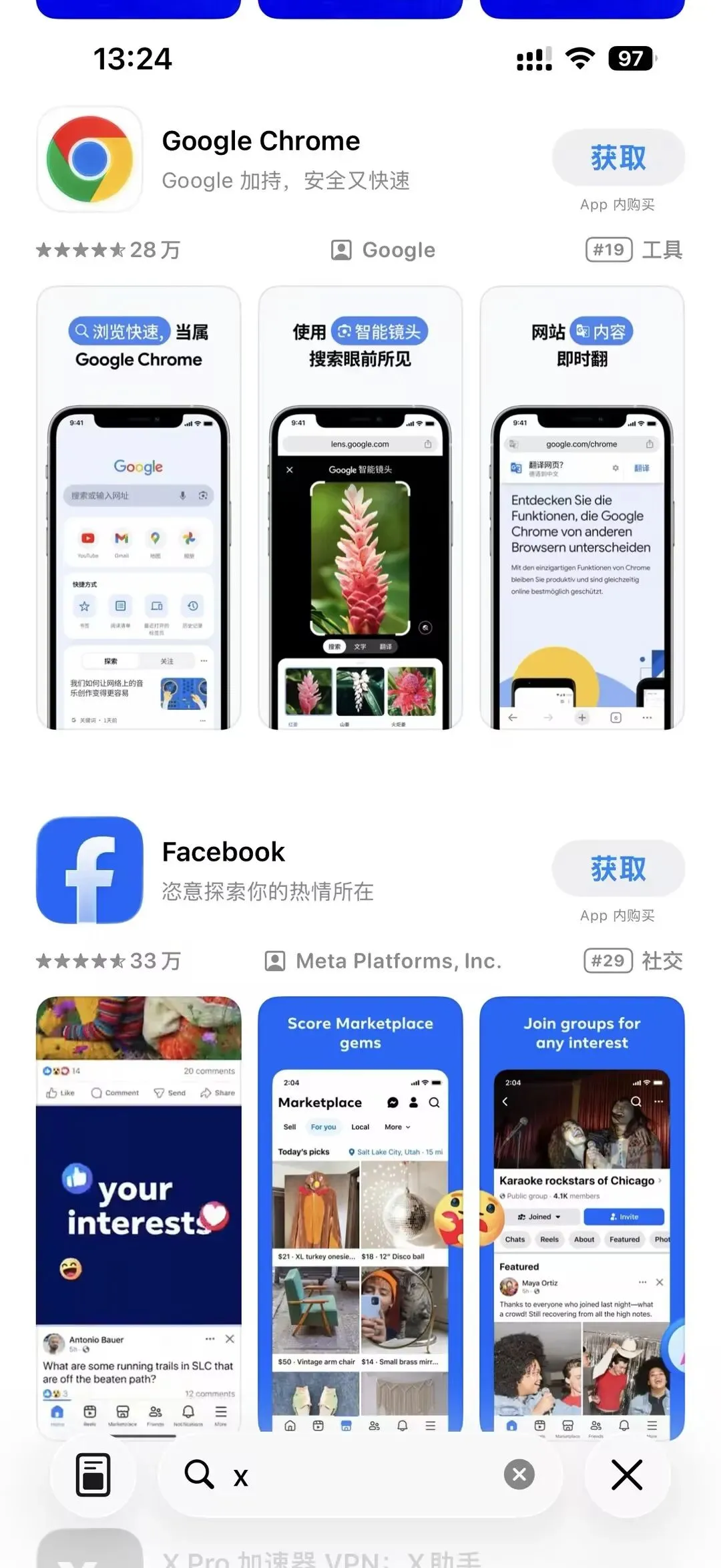 亲测有效:打开iPhone/iPad的App Store,直接搜索“X”“Facebook”“YouTube”,就能看到官方正版应用的下载入口,点击“获取”,用国区Apple ID验证后就能直接安装,全程不超过1分钟,和下载微信、支付宝一样顺畅,再也不用切换账号、折腾外区地址了✨