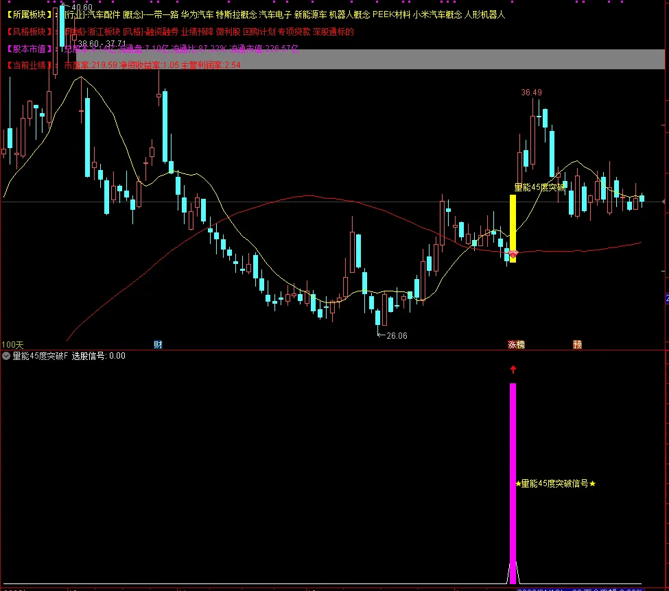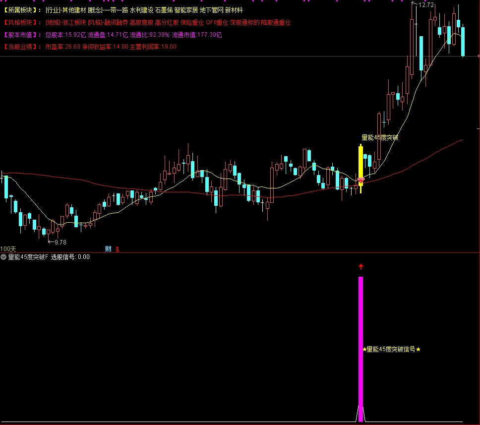 当所有上述条件同时满足时,公式会触发“共振信号”。在图表上,对应的K线会被高亮显示为醒目的黄色实体,并标注“量能45度突破”的文字及图标。