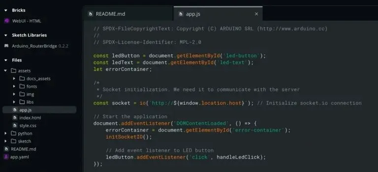 编辑您的应用程序的用户界面和交互现在变得更加舒适。Arduino App Lab 现在支持 HTML、CSS、JavaScript 及相关网页开发语言的语法高亮,提高了可读性并减少了用户构建界面时的错误。