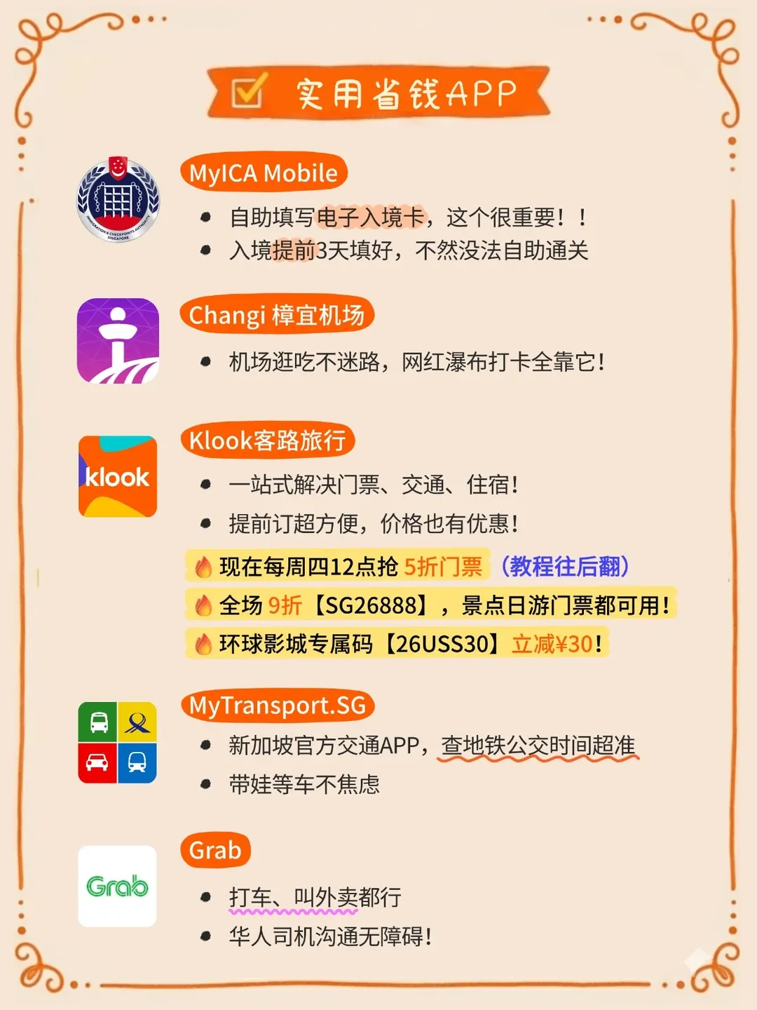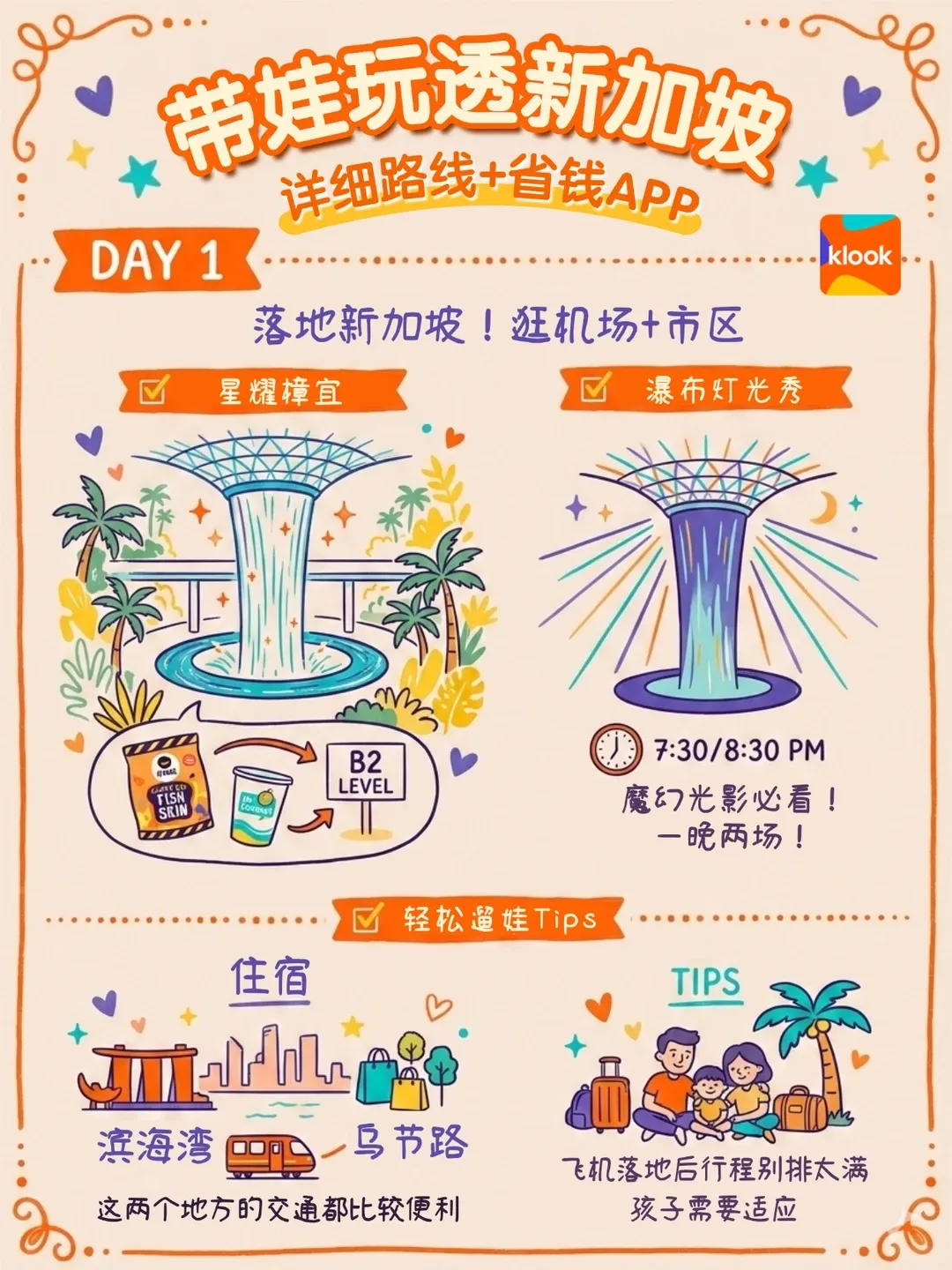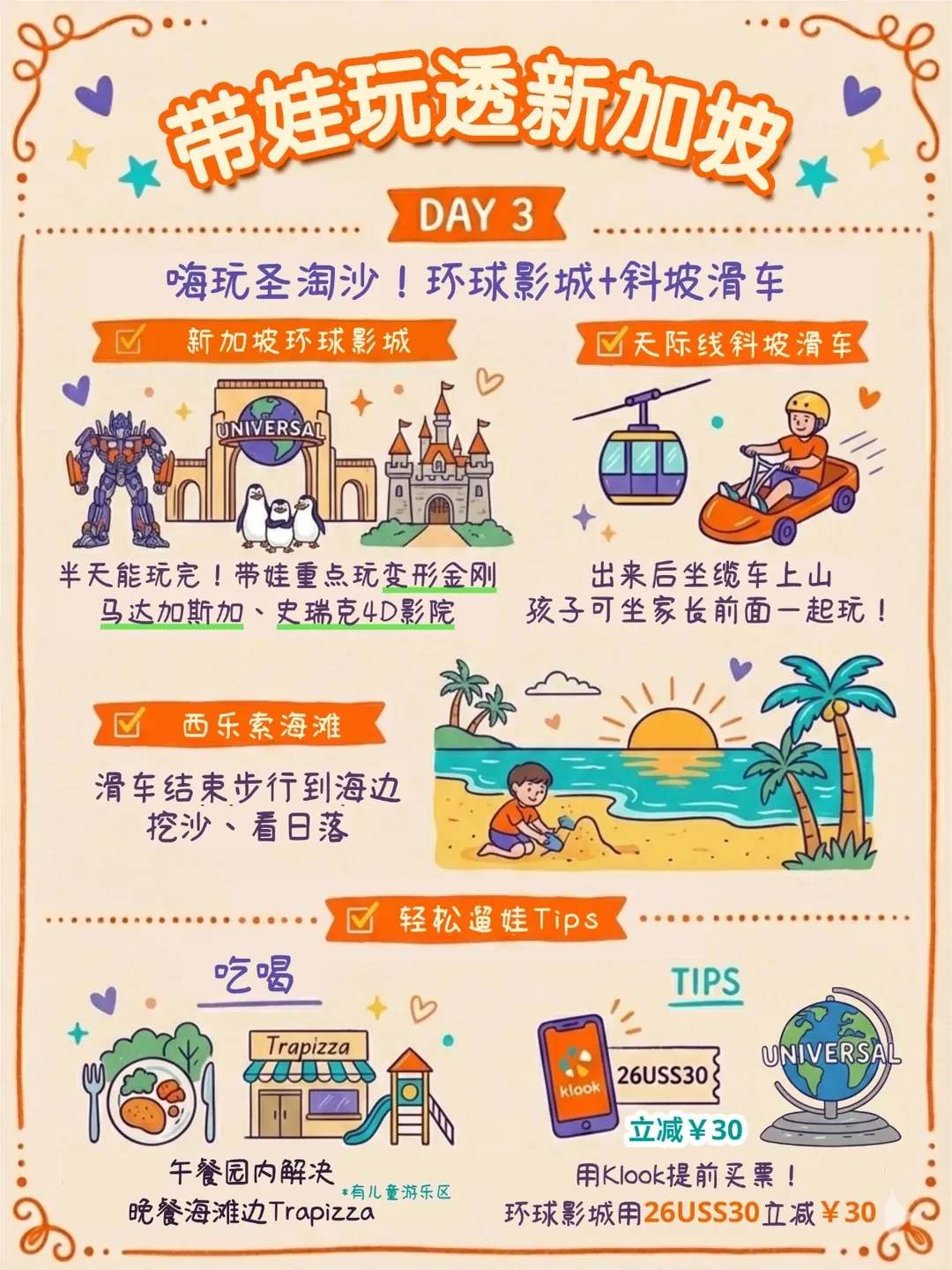 ✅ 交通:地铁+公交足够,6岁以下儿童免票。用MyTransport.SG查时间,Grab备用