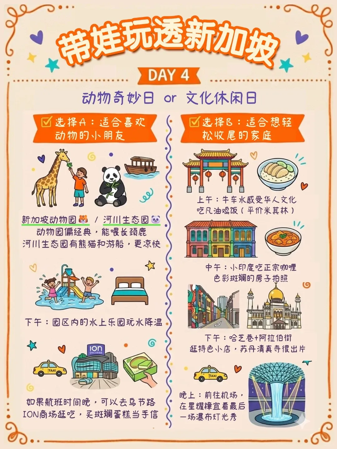 上午:新加坡动物园🐯/河川生态园🐼(都在同一园区,动物园偏经典,能喂长颈鹿;河川生态园有熊猫和亚马逊河游船,更凉快