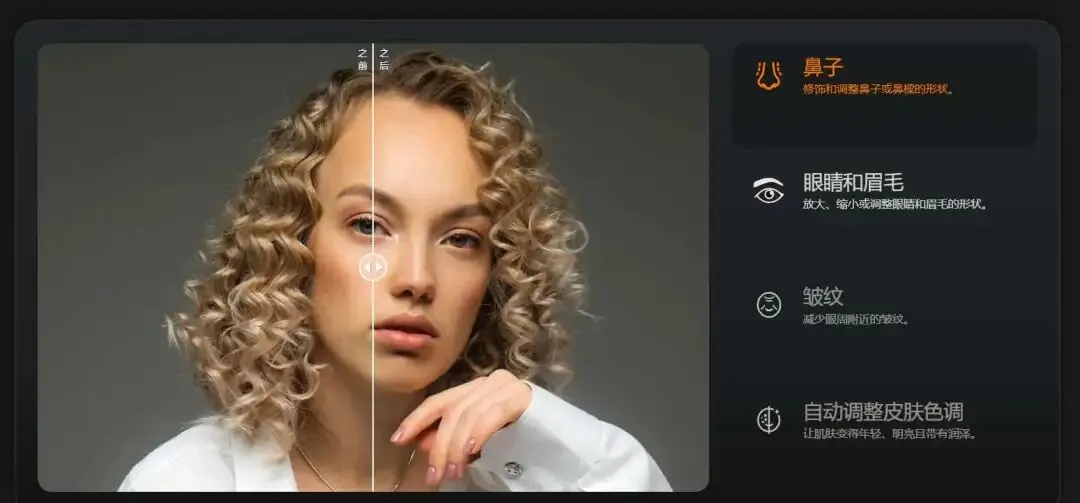 4. AI人像修饰工具:修饰和调整鼻子、手臂、眼睛、眉毛、腿部、皱纹、髋部和腰部等细节,让成品更细腻自然。