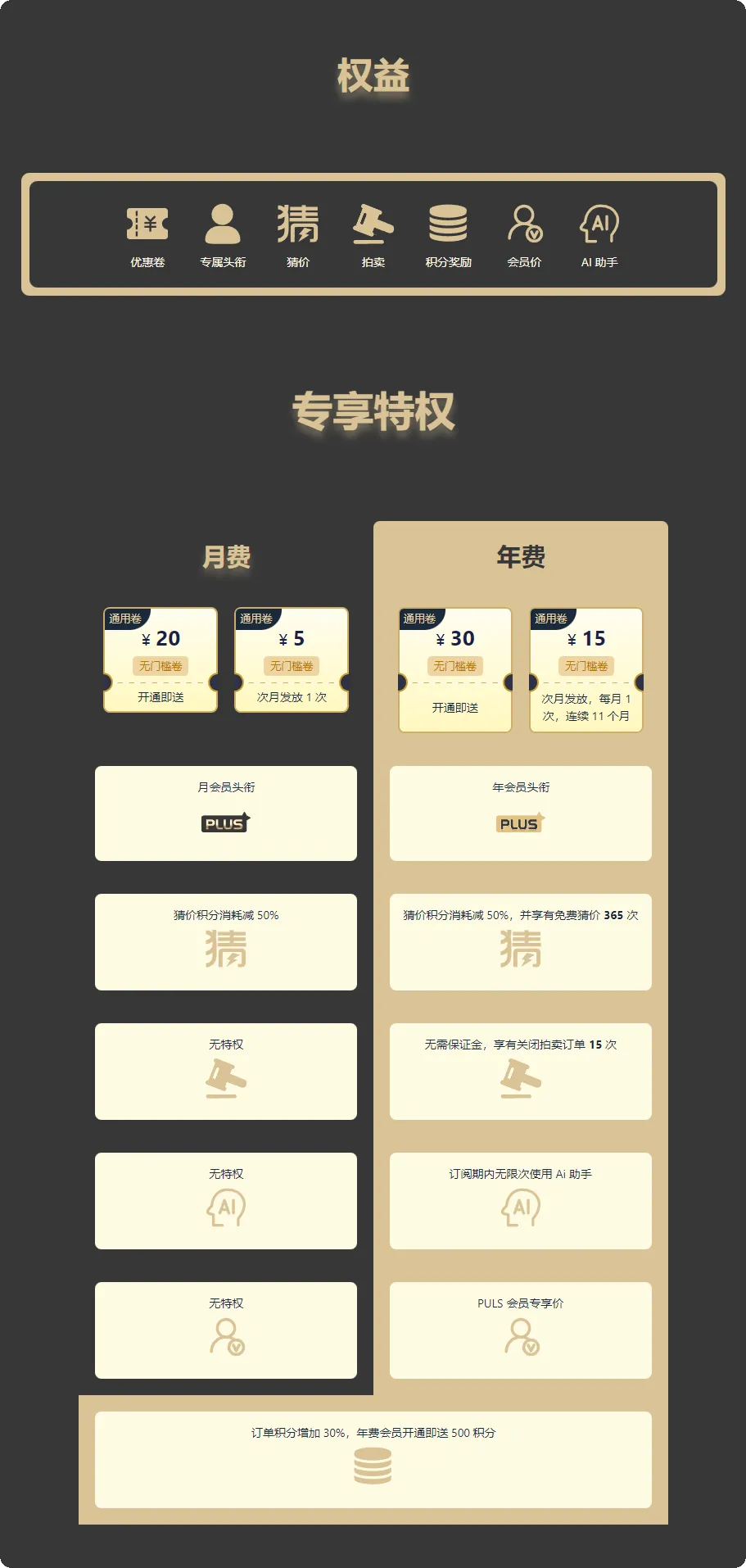 500积分,猜价积分消耗减50%,并享有免费猜价365次!无需保证金,享有关闭拍卖订单15次,无限次使用Ai助手,且享有专属礼品免费领取。
