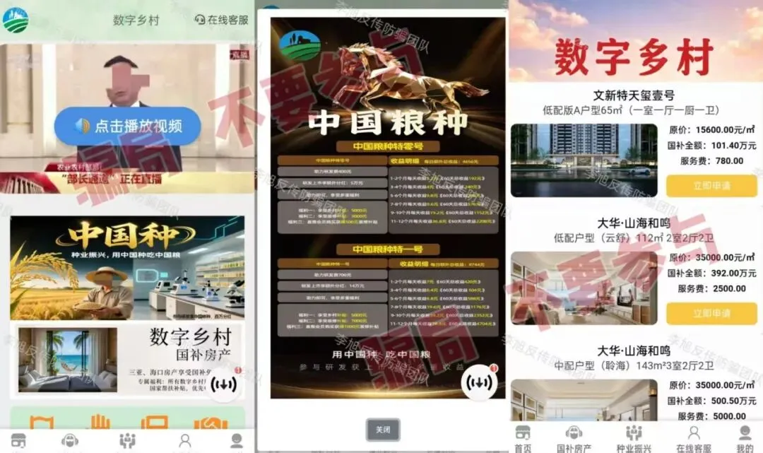 打着“数字乡村”旗号,利用“免费申请三亚、海口房产“等极具诱惑力的回报吸引参与者。并向其兜售“中国粮种”理财产品,承诺高额上市分红。