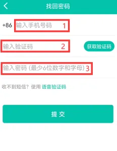 (7)进入到“找回密码”界面。如图7所示,在“标红1”处输入注册手机号,点击“获取验证码”。手机接收到一条短信验证码,在“标红2”处输入验证码,在“标红3”处输入新密码,点击“提交”按钮,完成登录密码修改,界面如图8所示。