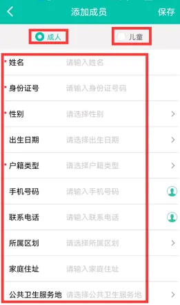 (6)点击“新增成员”进入到“添加成员”页面,需要添加家庭成员类型选择“成人”“儿童”后,完善相应基本信息后点击右上角的“保存”,保存成功后继续添加其他家庭成员,如图18。