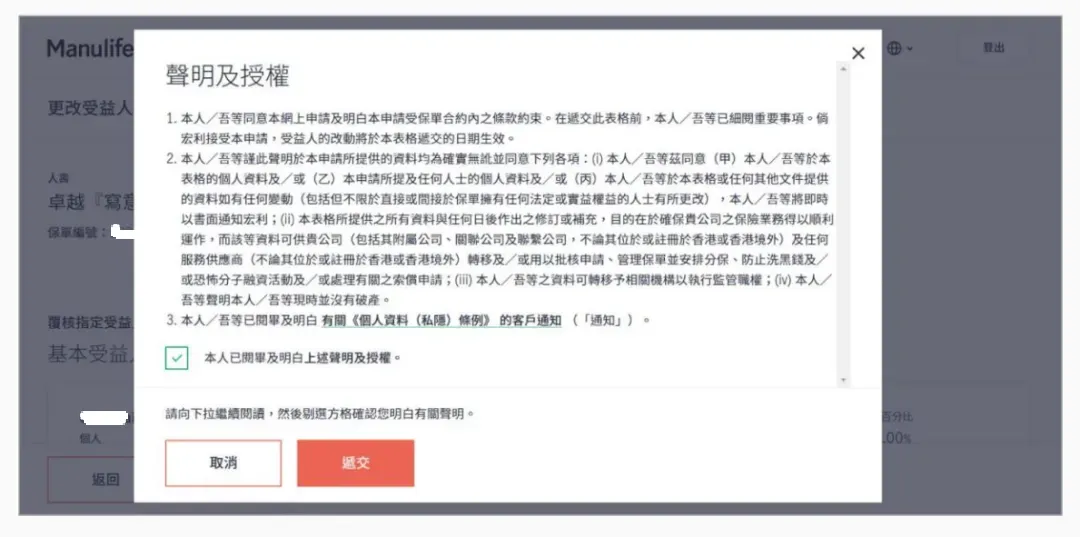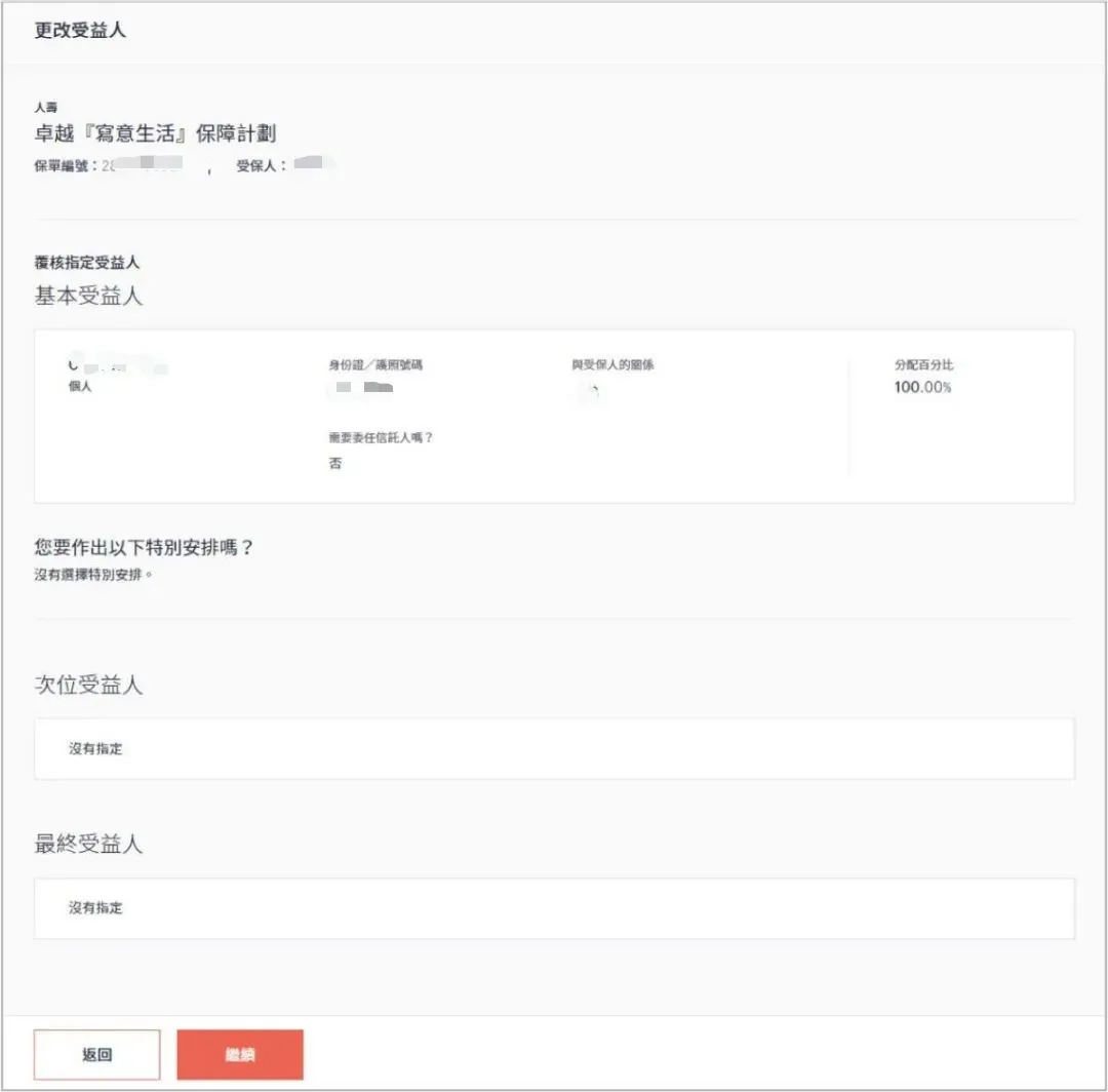 选择你想更改受益人的保单,填写受益人的资料,并查看现有受益人资料。