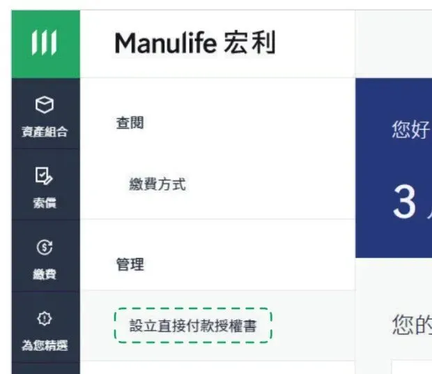 设立自动转账缴付保费:在主目录中选择“缴费”>“设立直接付款授权书”。