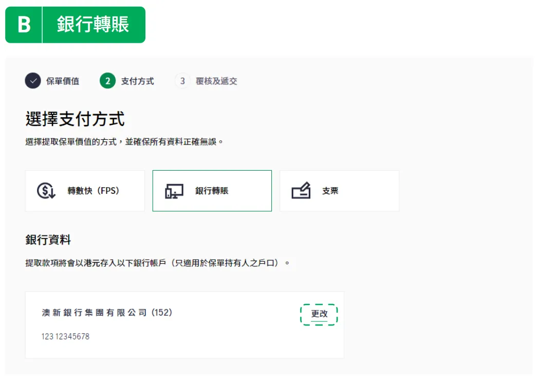 核对并确认资料,阅读并同意声明后,根据指示设立自动转账的直接付款授权及/或缴付所需总额,完成更改申请。