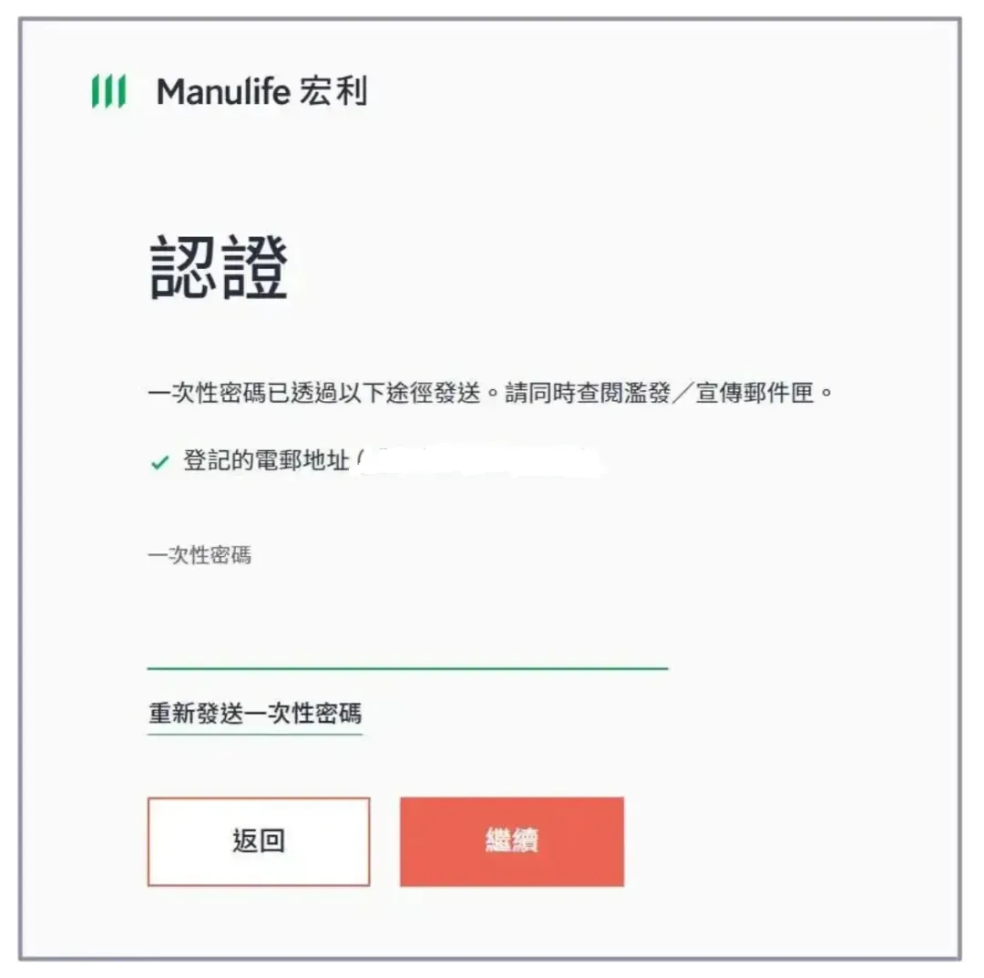 阅读认证步骤后,选择通过登记在保险公司的手机号码(推荐)或电邮收取一次性密码,填写相关信息后点击“发送一次性密码”。