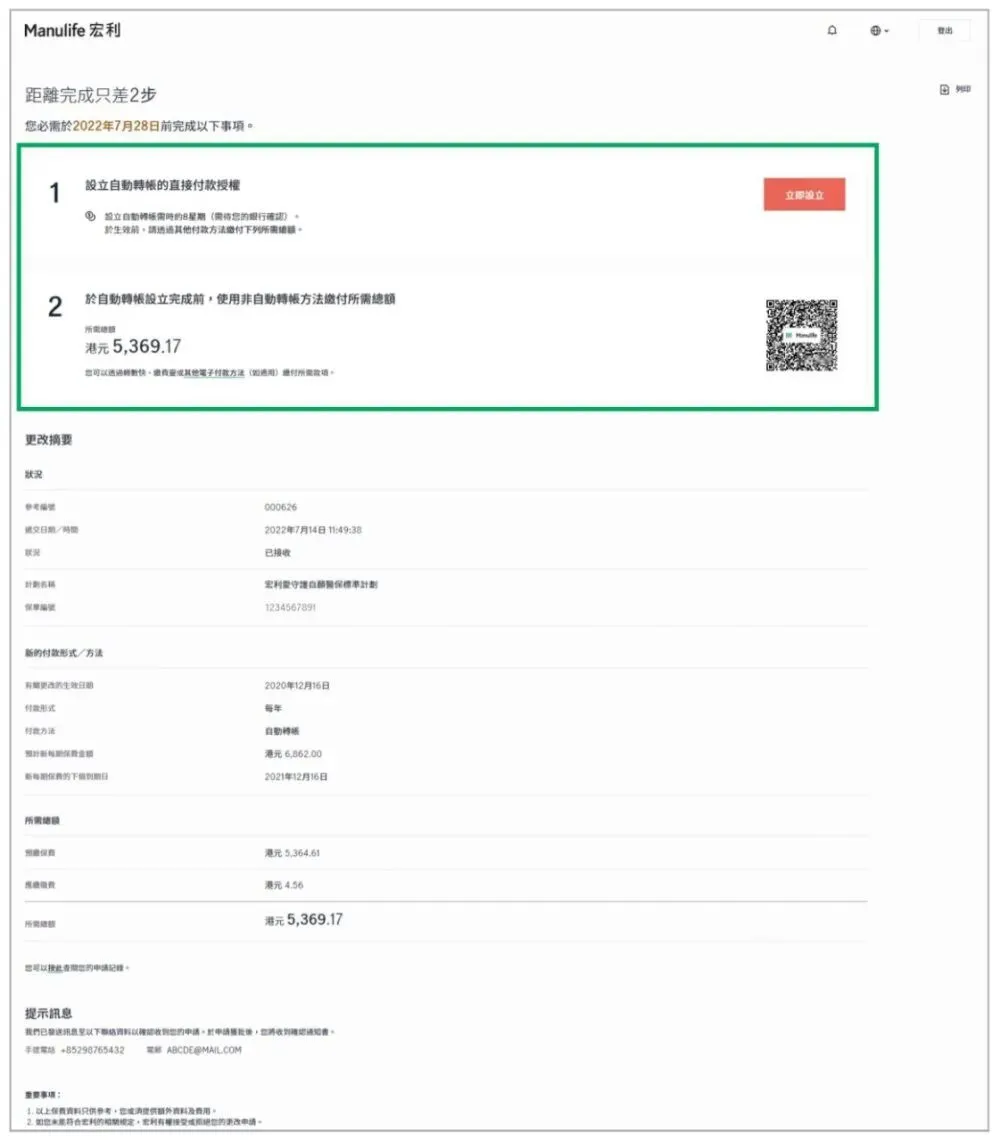 核对并确认资料,阅读并同意声明后,根据指示设立自动转账的直接付款授权及/或缴付所需总额,完成更改申请。