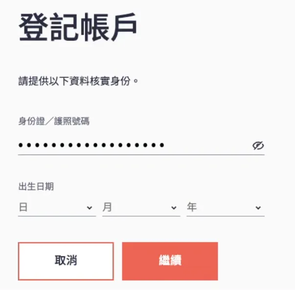 新用户需先登记账户,输入身份证件号码及出生日期,点击“继续”。