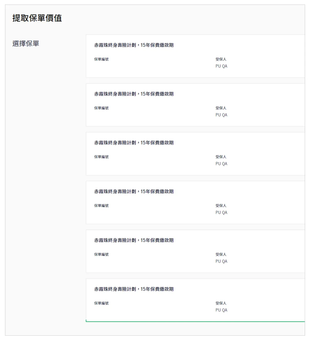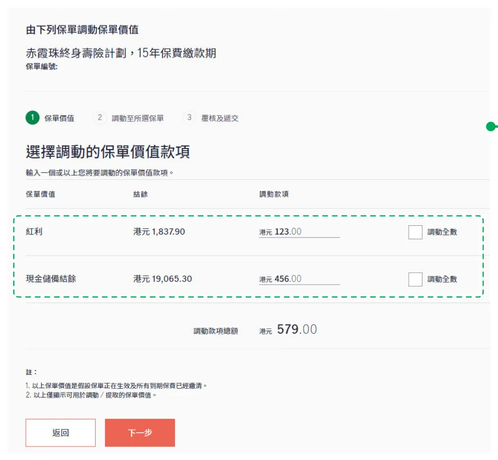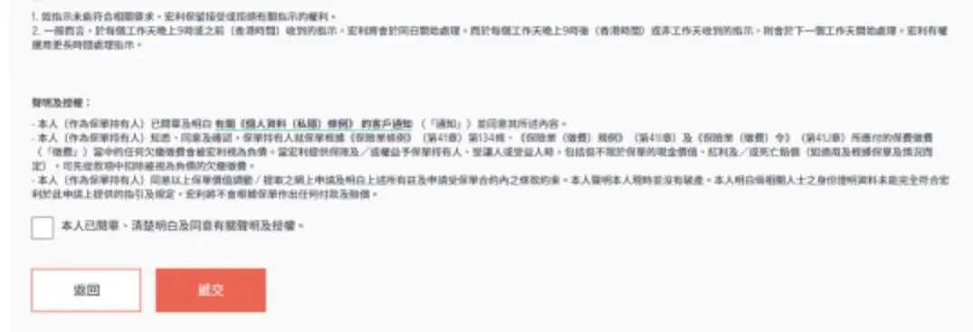 选取合资格的保单,填妥相关资料,复核资料并同意使用条款后,递交指示。