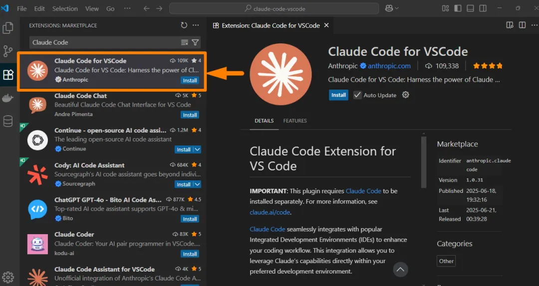 搜索“Claude”,找到由 Anthropic 官方发布的 “Claude” 插件并安装。