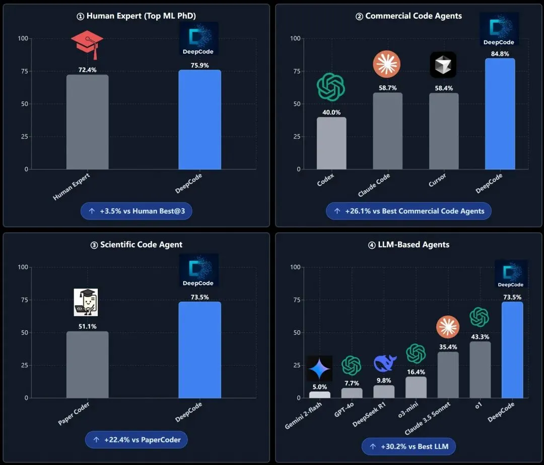 在 OpenAI 的 PaperBench 基准(20 篇 ICML 2024 论文,8316 个可评测组件)上,DeepCode 达到 75.9% 准确率,超过顶尖 ML PhD 人类专家(72.4%),大幅领先商业工具如 Claude Code(~58.7%)、Cursor 等(+26%+)。