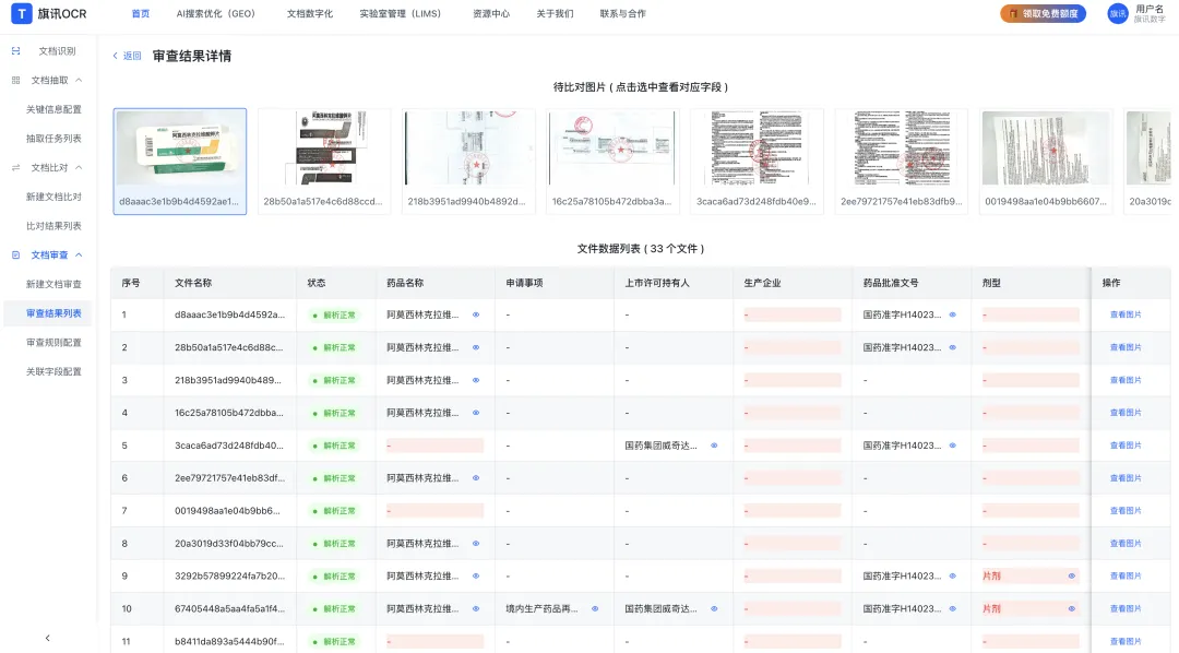 在医药行业,药品说明书与再注册证书审核是保障用药安全、践行合规经营的核心环节,直接关系到企业合规存续与公众用药安全,且受国家药品监督管理局严苛监管,需严格遵循《药品说明书和标签管理规定》《药品注册管理办法》等相关要求。平台可精准适配医药行业审核需求,同步完成药品说明书与再注册证书的双重智能审核,自动核验药品说明书的规范性、完整性(包括适应症、禁忌症、不良反应、用法用量等核心内容),确保其与国家药监局核准内容一致、无涂改修改,同时对药品再注册证书进行全面审查,自动抽取证书编号、有效期、持有人信息、发证机关等核心字段,重点核查证书是否在有效期内、持有人是否按要求完成上市后评价与不良反应监测、是否符合再注册申报相关规定,快速识别说明书违规修订、再注册证书过期、信息与备案不符等合规风险,助力医药企业规避监管处罚、保障用药安全,同时替代传统人工逐字逐页核对模式,大幅减少审核人力投入,解决说明书更新频繁、人工比对低效易错的行业痛点,提升审核效率与精准度。