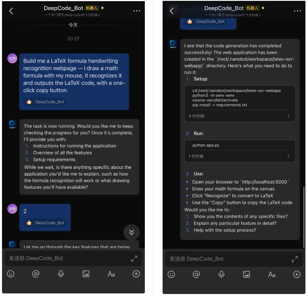 - 或者私聊:“做一个带暗黑模式 + 拖拽排序的 Todo List 前端”→ bot 会实时回复代码、运行说明、进度更新,甚至任务状态查询。v1.2.0(2 月 11 日发布)专门加了这个集成:用 Docker Compose 一键启动 DeepCode + nanobot,支持飞书 WebSocket + Telegram Polling。作者喊的口号超级 vibe:“Step away from your laptop — make vibe coding even more vibe! ”这对远程团队、在地铁/咖啡厅想快速验证想法的人来说,简直革命性——coding 终于可以随时随地、不开电脑了。