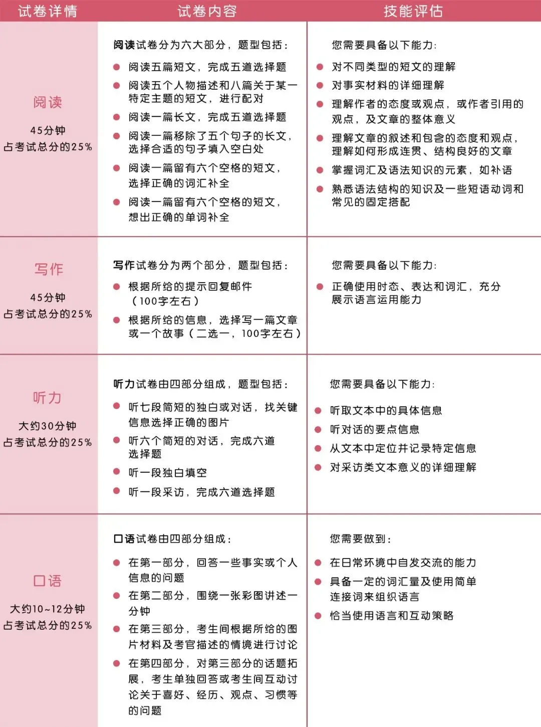 该系列证书对考生的英语听、说、读、写综合应用能力进行考察。考试的试题与阅卷都由具备丰富英语教学经验的专家们完成。命题者综合考虑学习者在不同年龄段心智、情感、认知、语言能力以及答题习惯的发展特点,循序渐进帮助学习者提高英语水平。成绩及格者获得由英国剑桥大学考试委员会颁发的考试成绩证书。