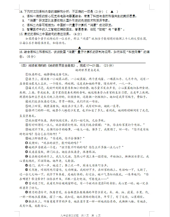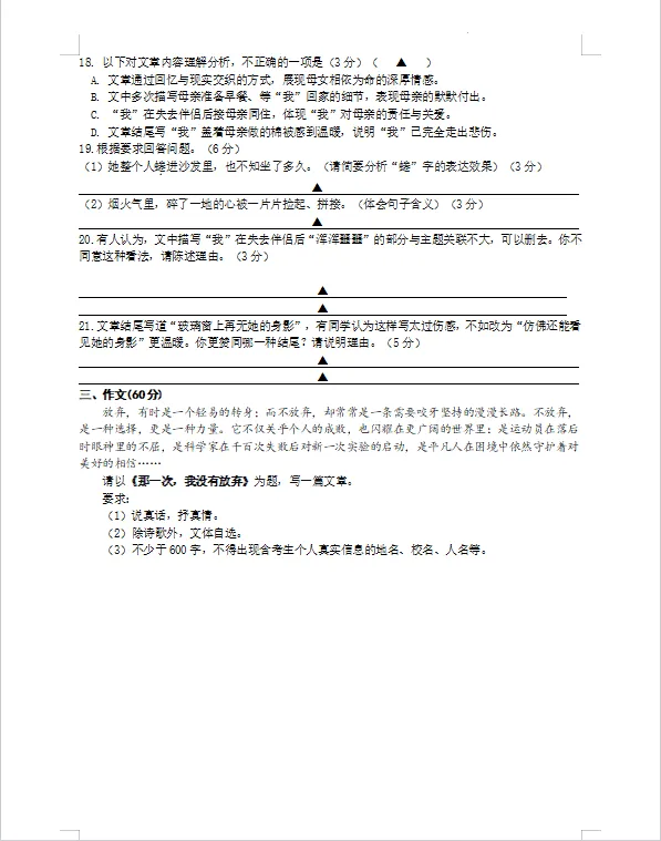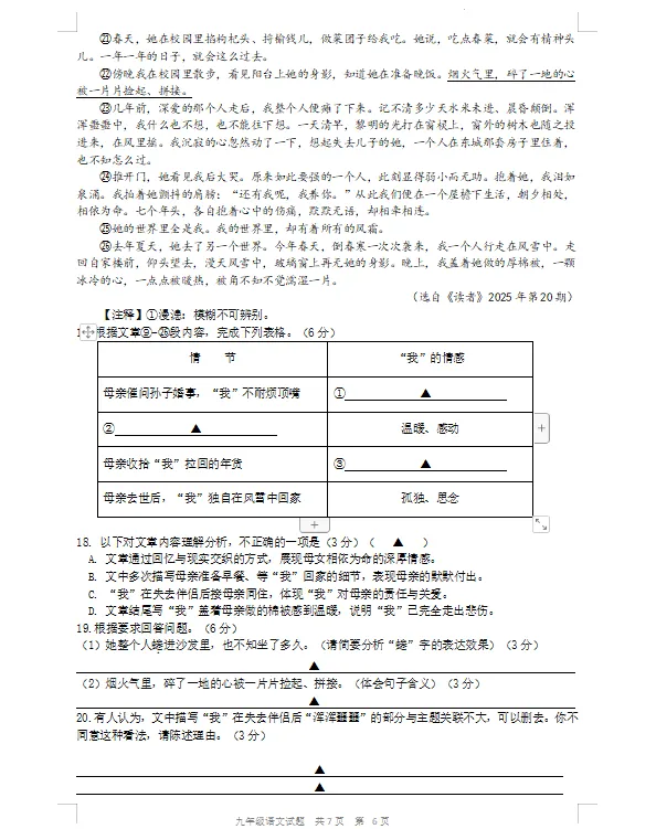 18. 以下对文章内容理解分析,不正确的一项是(3分)(▲)A. 文章通过回忆与现实交织的方式,展现母女相依为命的深厚情感。B. 文中多次描写母亲准备早餐、等“我”回家的细节,表现母亲的默默付出。C. “我”在失去伴侣后接母亲同住,体现“我”对母亲的责任与关爱。D. 文章结尾写“我”盖着母亲做的棉被感到温暖,说明“我”已完全走出悲伤。