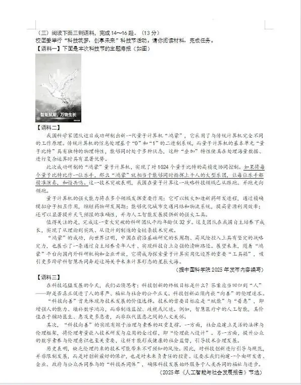 14.下列对三则语料内容的理解和分析,不正确的一项是(3分)(▲)A. 语料一海报的核心视觉将电路与藤蔓结合,寄寓了科技与自然和谐共生的美好愿景。B. “鸿蒙”研发团队主要依赖从国外引进的先进技术和资深专家。C. 语料二内容可概括为:中国新一代量子计算机“鸿蒙”成功研发。D. 智慧医疗中的人工智能应辅助医生、普惠患者,体现“赋能”与“普惠”。