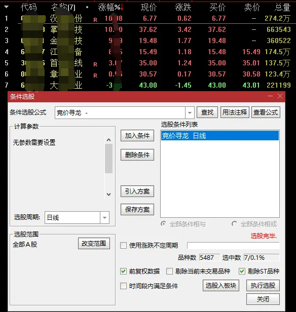 ②交易日9:25后-9:30之前,快捷键 Ctrl+T执行选股,或者设置竞价预警