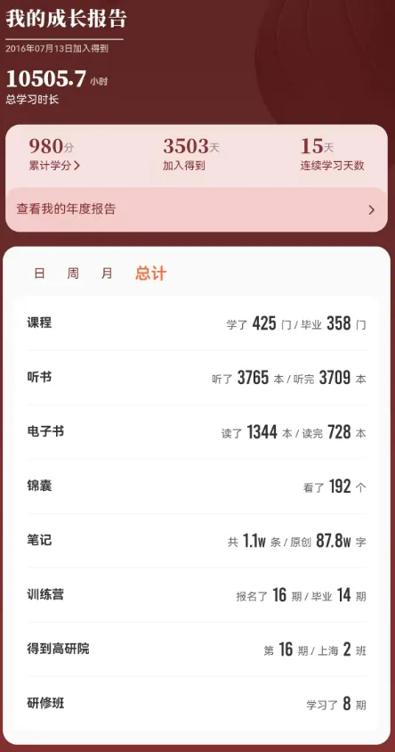 电子书我主要是笔记本电脑+外接大屏幕显示器。笔记本电脑方便随身带,大屏幕显示器在家里、在办公地点则各装了一个。讲真,“得到”的网页端记录学习数据不准,会漏统计、少统计。但是完全不打紧,我对数据总体脱敏了。