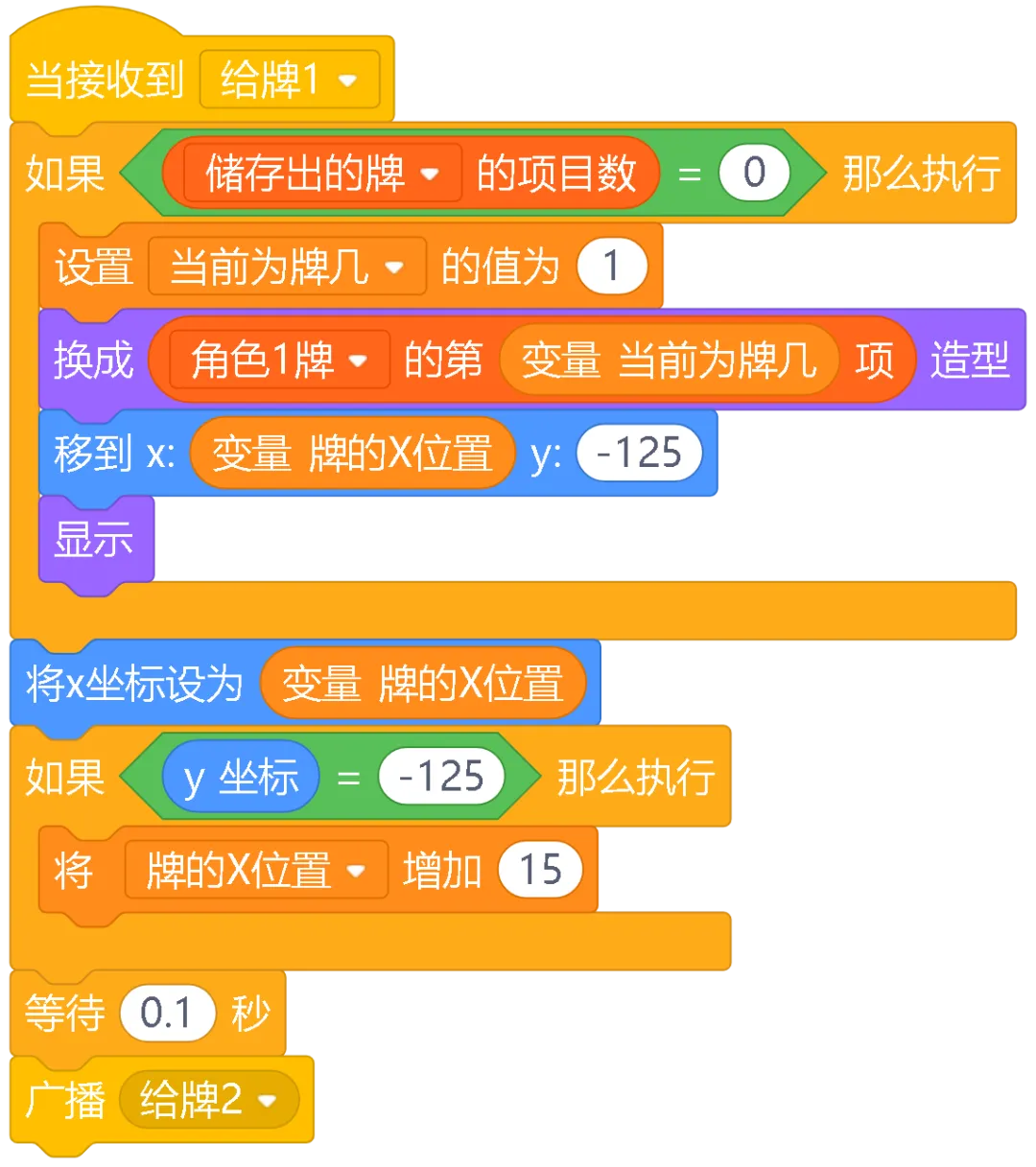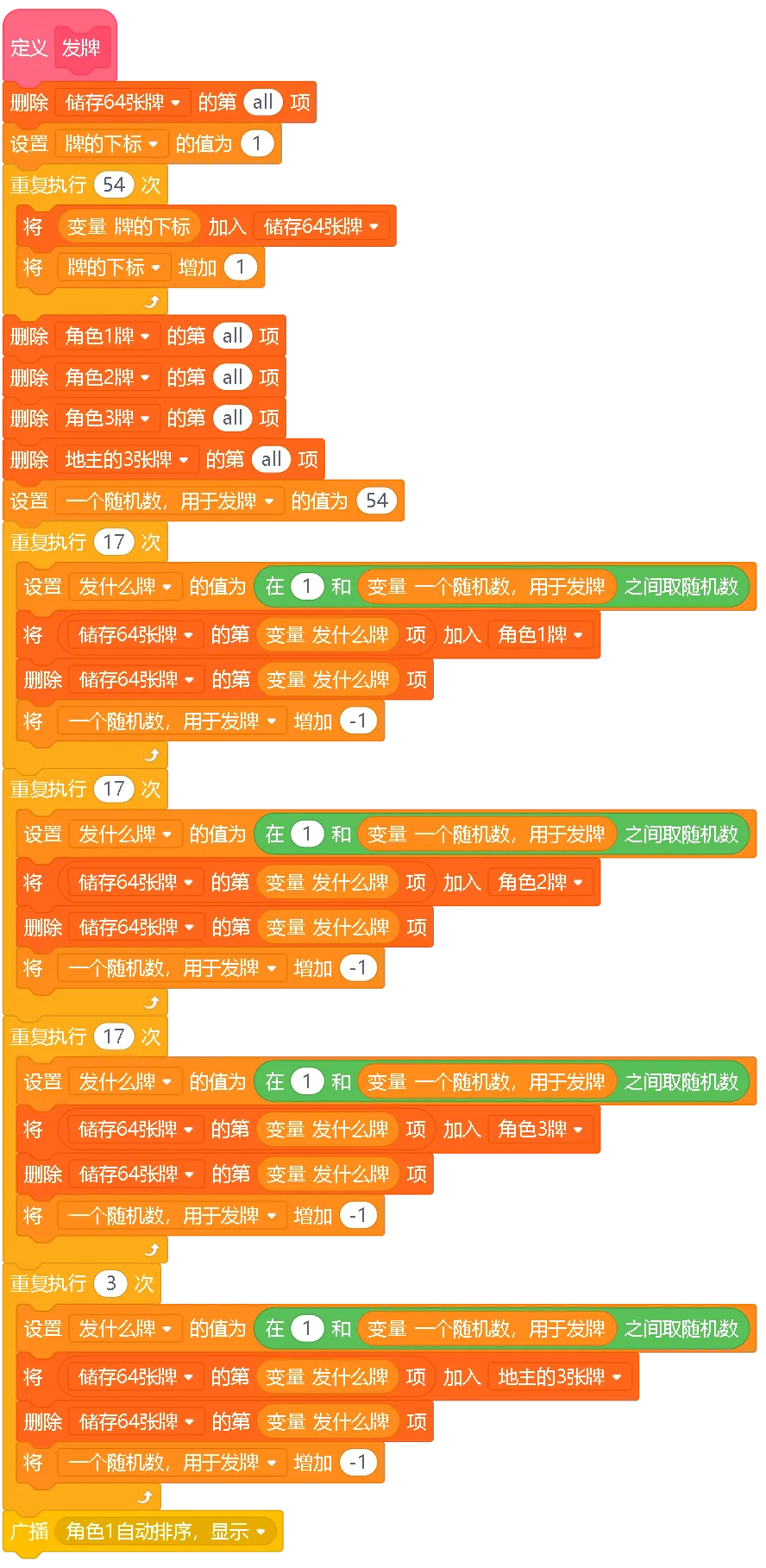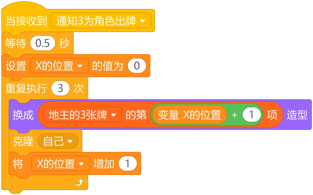 重复x次:让角色做固定次数的事情,比如发牌时要发17次牌给每个角色
