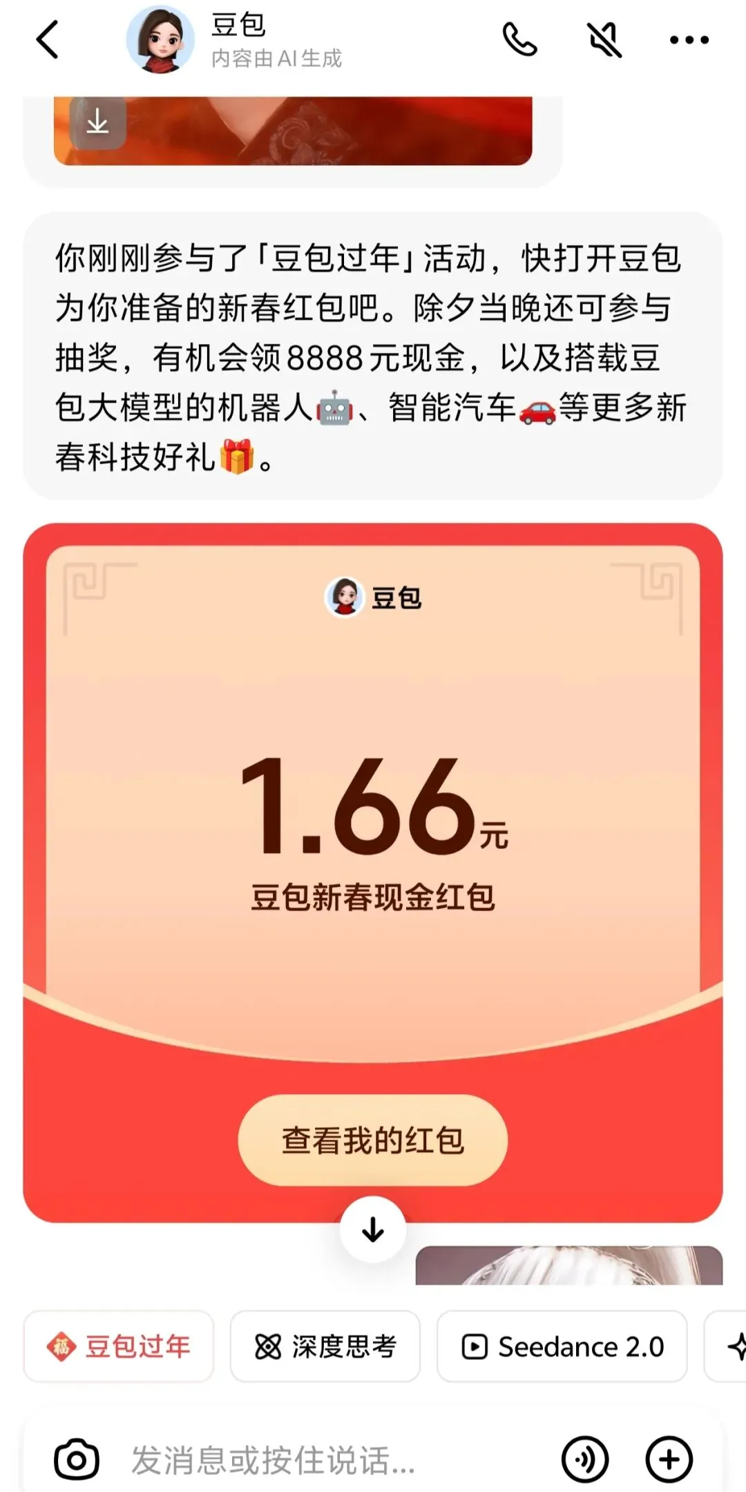 豆包红包是字节跳动旗下豆包App在2026年春节推出的福利活动,今晚20:00起可抽最高8888元现金红包,除夕春晚还能赢取机器人、智能汽车等科技好礼,小额红包已吸引大批用户参与。