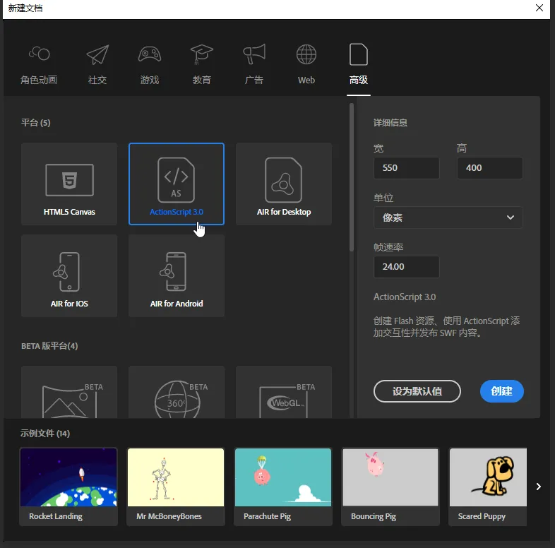 1、双击打开Adobe animate,在主页新建一个AS3文件;