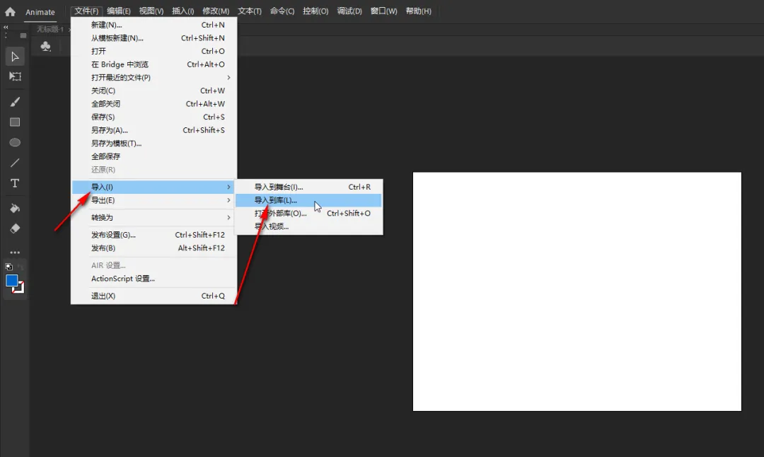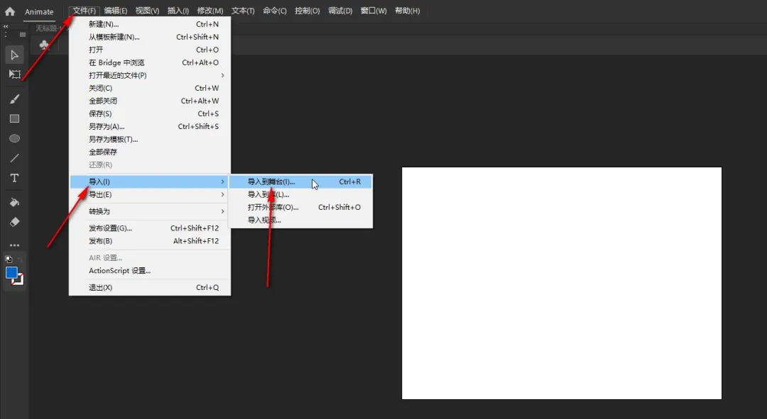 2、进入编辑界面后,按Ctrl+R键,或者在左上方点击“文件”——“导入”——“导入到舞台”;