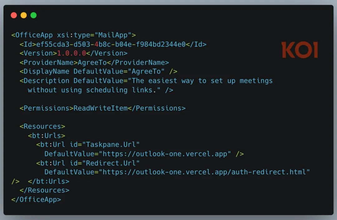 令人遗憾的是,AgreeTo 的 Outlook 插件版本却一直留在微软 Office 插件商店中,其指向的 Vercel 子域名 outlook-one.vercel.app 因项目废弃成为无主可认领状态,而更关键的是,这款插件在上架时被微软授予了ReadWriteItem 权限, 可直接读写用户的邮件内容,这一为满足会议调度功能设置的权限,也为后续的恶意攻击埋下了致命伏笔。