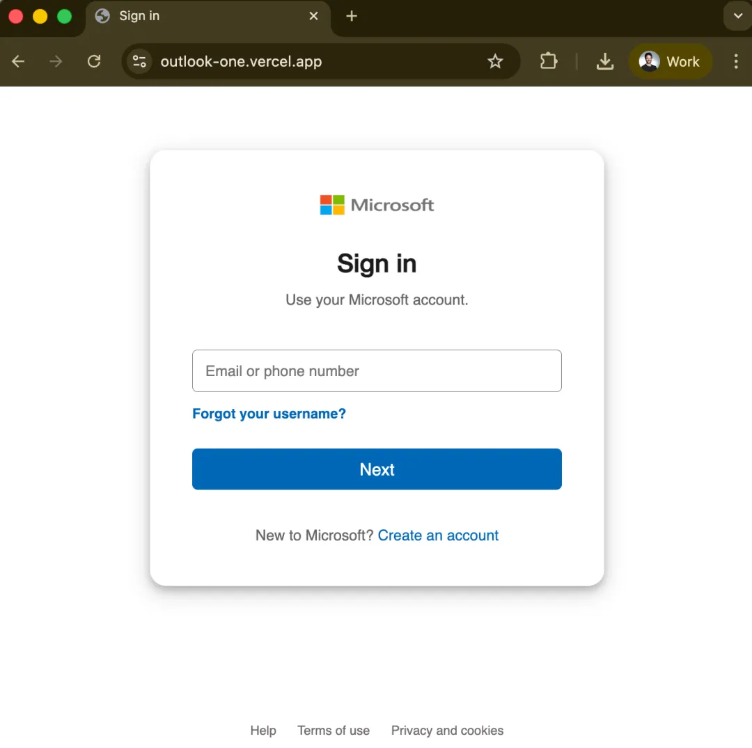 攻击者并未花费过多精力突破微软的安全防线,而是简单认领了无主的 outlook-one.vercel.app 域名,部署了一套包含伪造微软登录页、凭证收集脚本、数据泄露程序和重定向页面的钓鱼工具包。