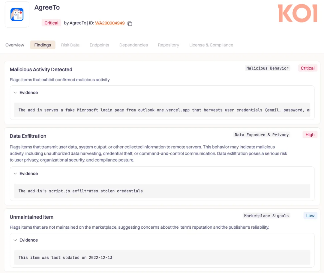 2026 年 2 月 11 日,Koi Research 发布的一份安全研究报告,揭开了首个在野生环境中被发现的恶意 Microsoft Outlook 插件:AgreeToSteal