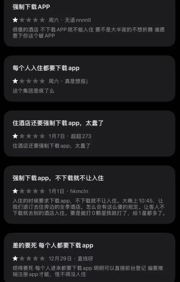 说白了,酒店是提供住宿服务的,只要客人身份合法、支付了房费,合同成立,你就得让人睡觉。强制下载App,甚至以此为由拒绝接待,往小了说是服务意识淡薄,往大了说就是违约甚至违法。