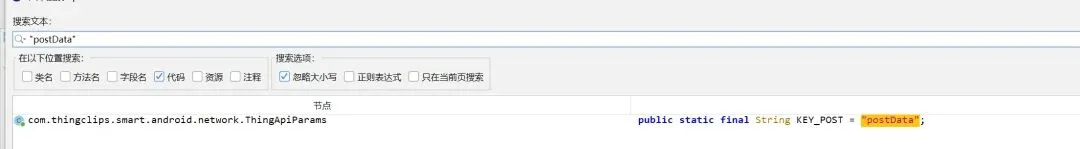 进行反编译,关键字搜索:”postData”,发现只有一个,那就直接来分析