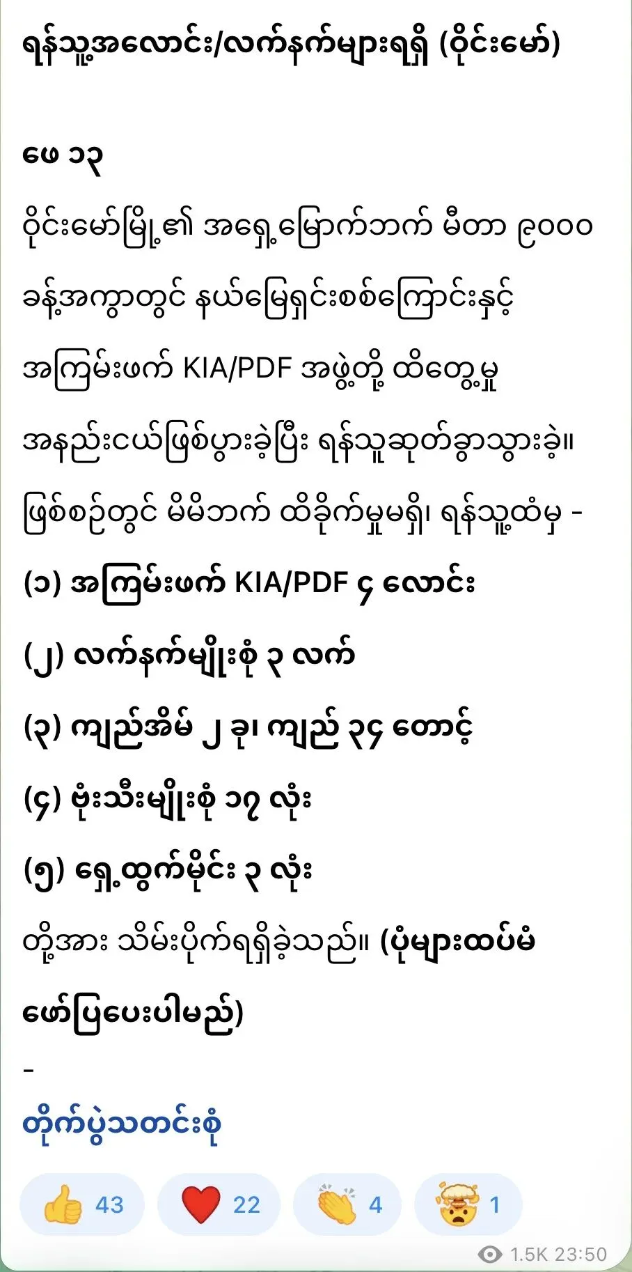 今年以来,PDF成员成批成批向军方投诚,同时当地民众也在持续,准确地提供相关情报……