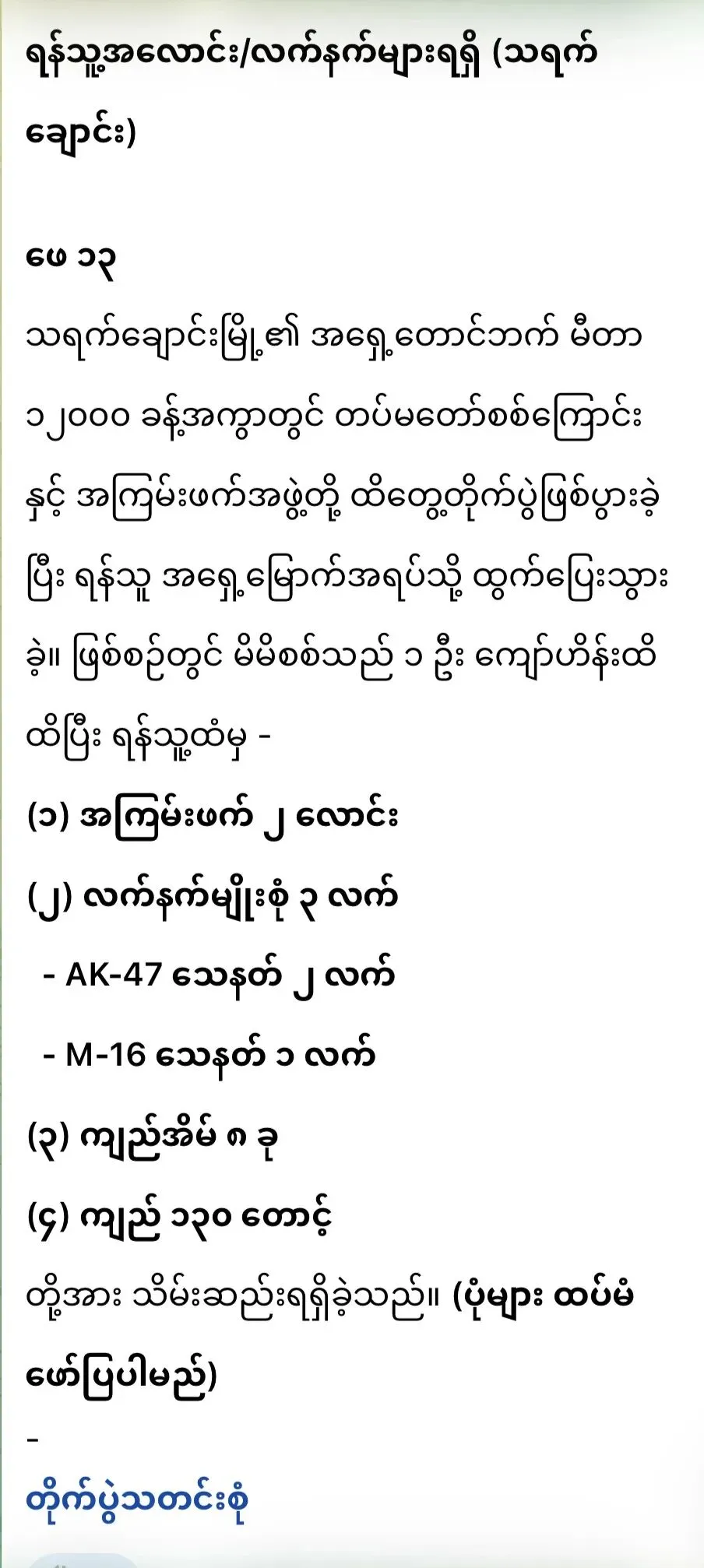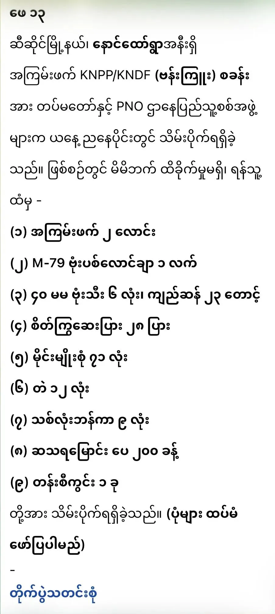 2月13日,在昔胜镇瑙透村附近的”KNPP/KNDF(班克鲁)”营地,于当日下午被国防军与PNO地方民兵联合攻占。