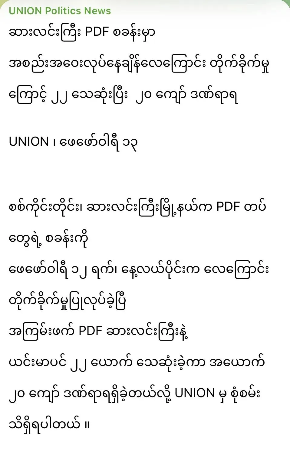 据消息称,2月12日中午,实皆省萨林基镇的PDF部队营地遭到空袭,造成22人死亡,20余人受伤。