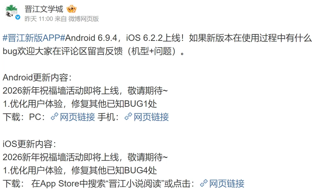 晋江文学城于2026 年 2 月 13 日 11 时发布官方微博,宣布 Android 6.9.4、iOS 6.2.2 版本正式上线。