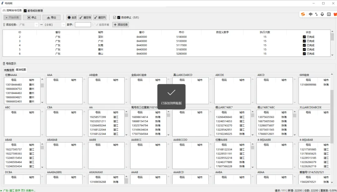 [电脑软件]号码网手机靓号筛选软件V0213 使用方法: 1.添加任务(支持自定义搜索数字) 2.开始任务 3.有喜欢号码双击下单 (现在有个小问题,筛选一个指定的数字只能搜3000号码,需要自己添加自定义数字才能刷的更多,这个问题待修复有解决办法私我一下) 下载链接:https://wwasz.lanzoul.com/iNBac3ig4o7i 注意事项: 1.把文件city_data.json和号码网手机靓号筛选软件V0213.exe 2.放在一个文件夹目录下即可正常使用