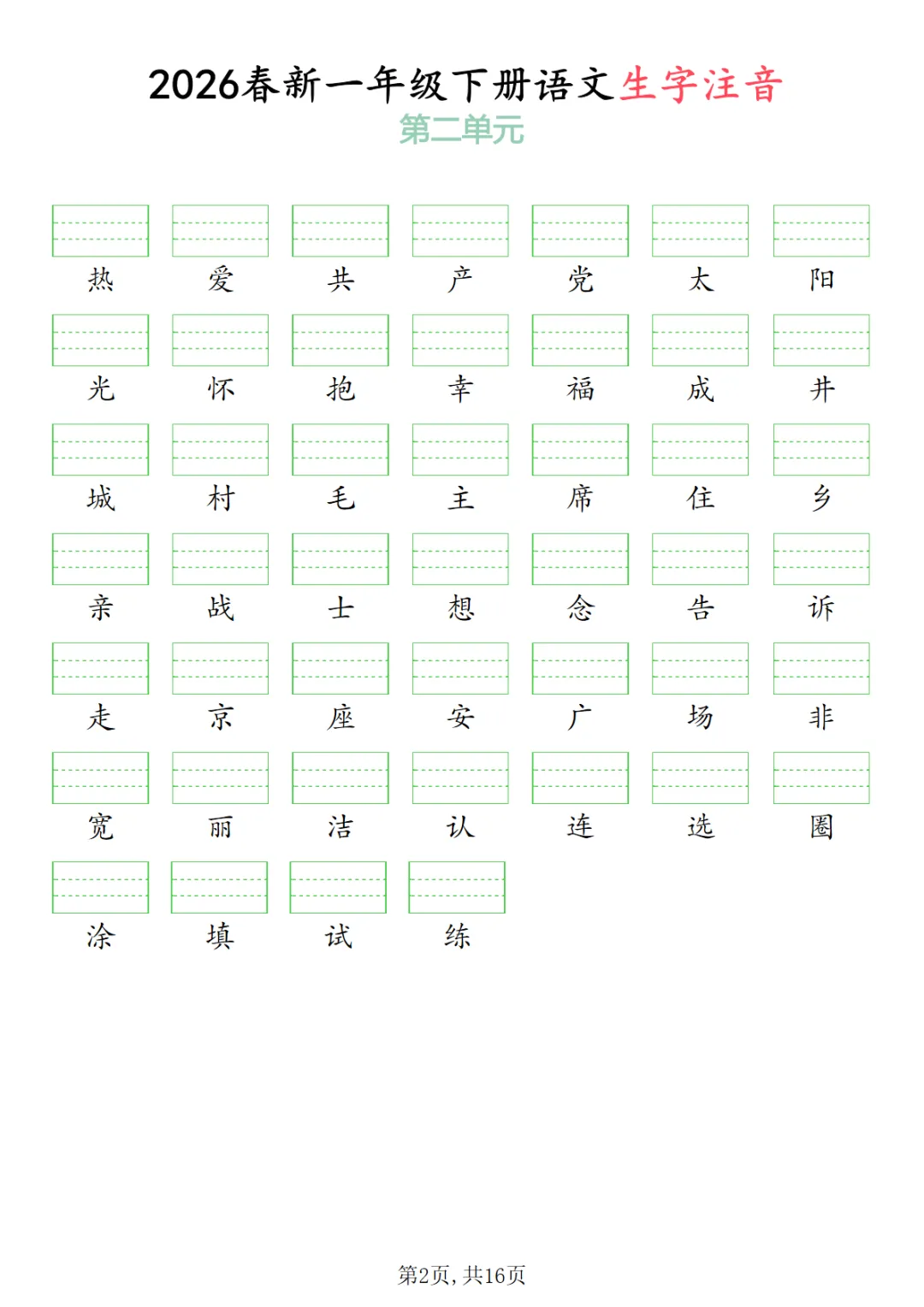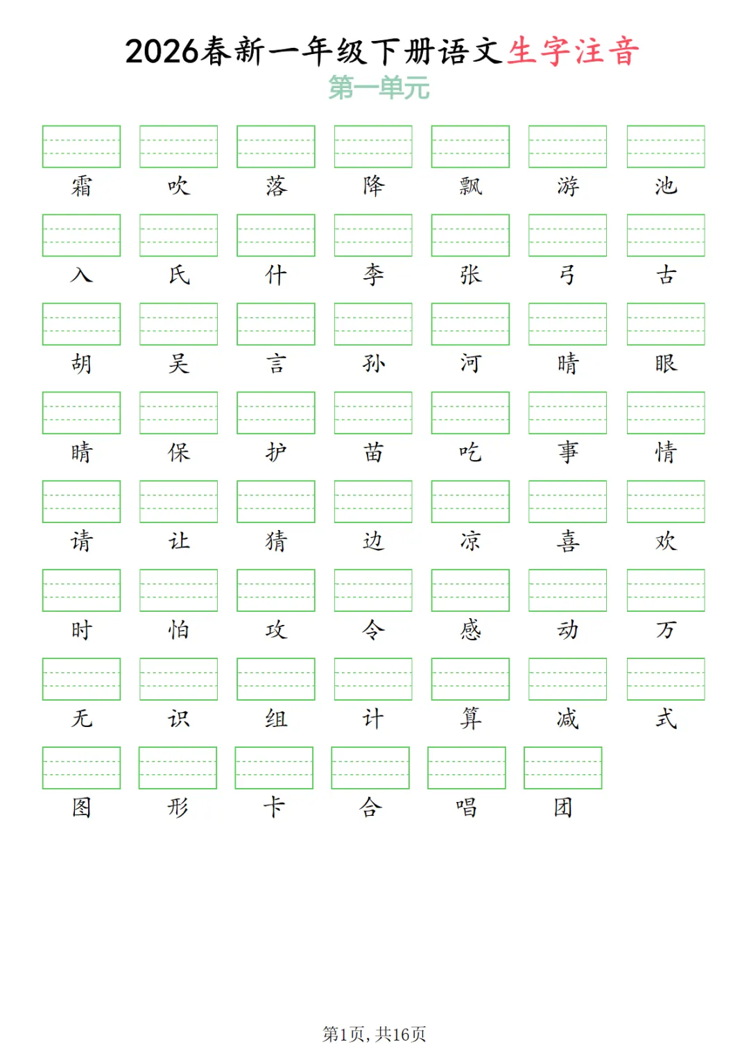【免费下载】一年级下语文2026春语文生字注音,PDF电子版,可打印,共16页