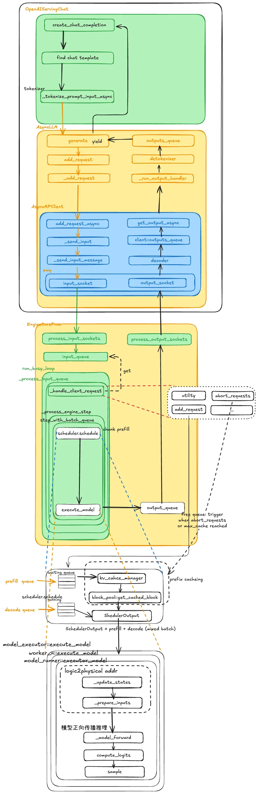 客户端请求API Server→ AsyncLLM→ EngineCore→ Scheduler→ KV Cache 管理→ Executor→ Worker→ Model→ 输出返回