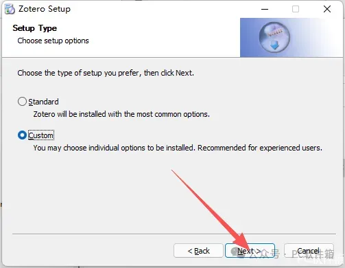 5.选择【Custom】,点击【Next】。