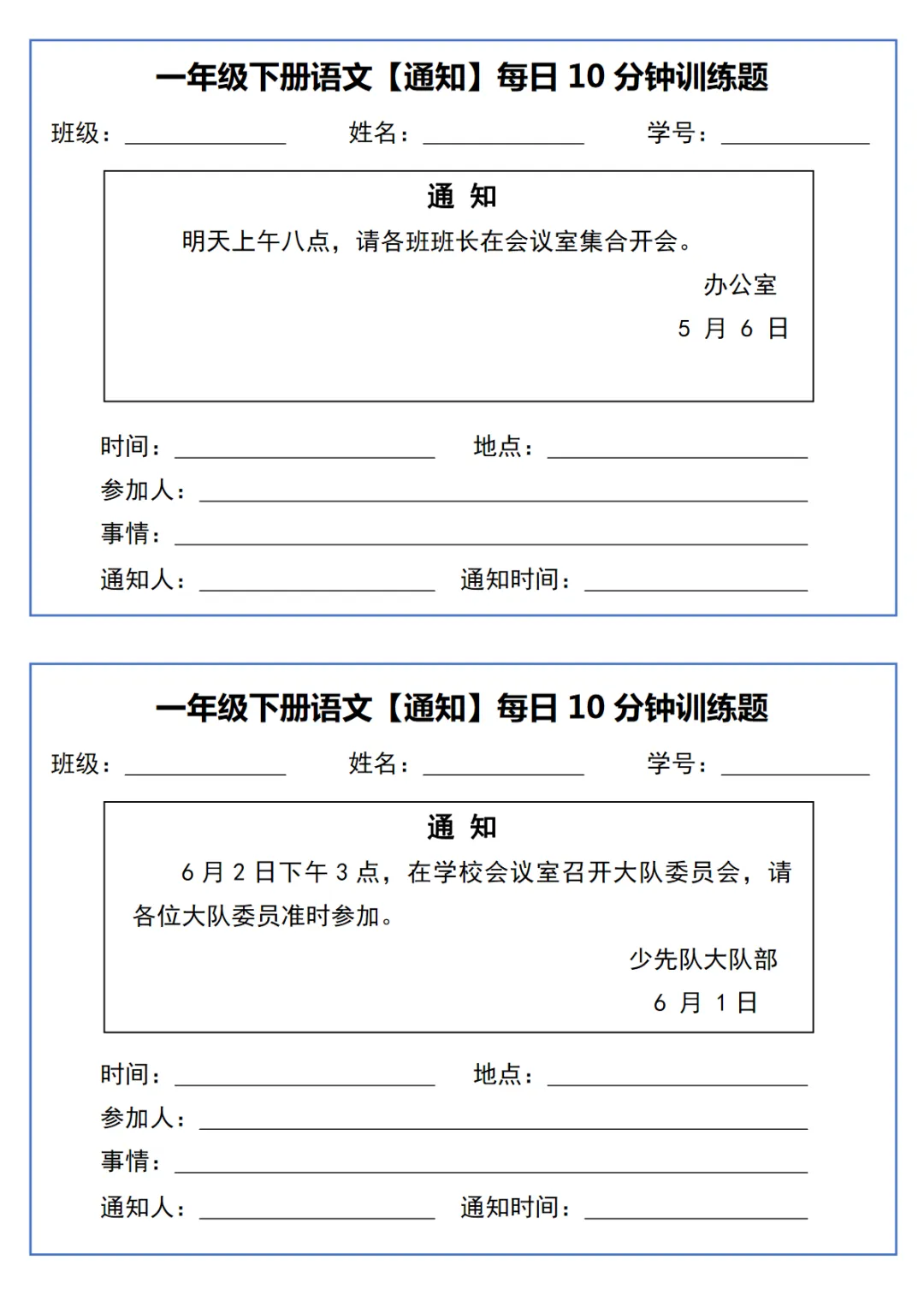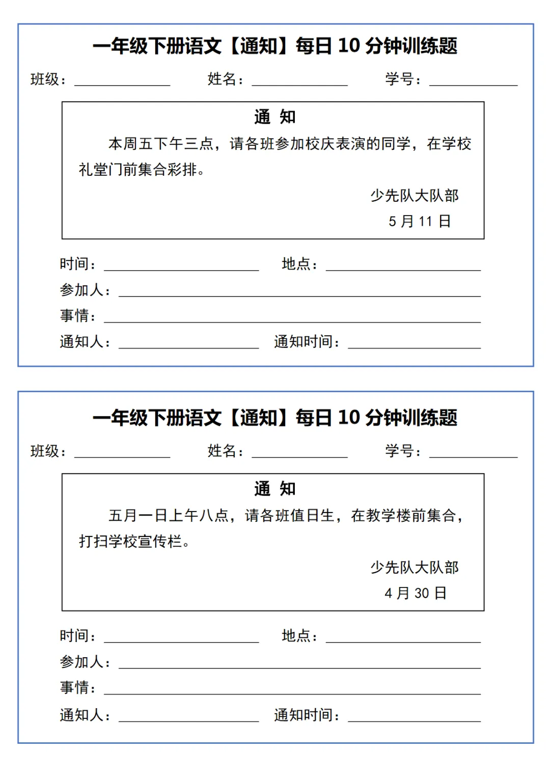 【免费下载】一年级(下)语文《通知专项》每日10分钟训练